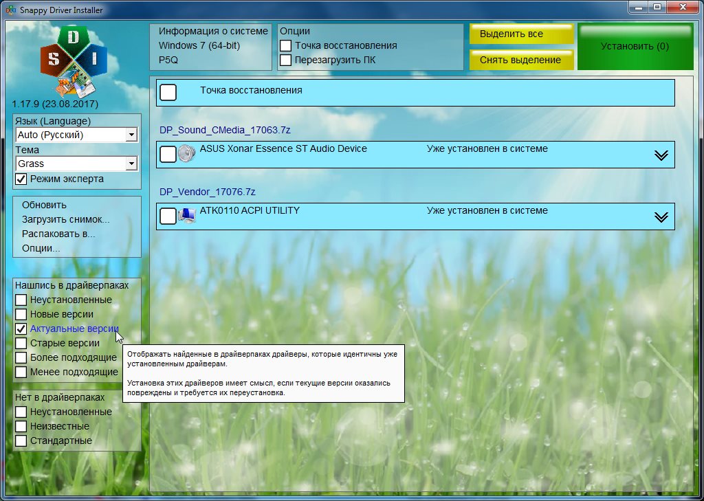Кнопка “Установить” запускает установку выбранных драйверов.