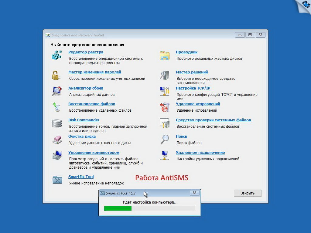 6. В загрузчик-установщик установочного образа интегрирован набор инструментов для работы и восстановления установленной системы Microsoft Diagnostics and Recovery Toolset (DaRT10) а так же программа SmartFix Tool, которая автоматически исправляет наиболее распространённые проблемы и лечит компьютер даже от неизвестных вредоносных программ, с которыми не справляются антивирусы.