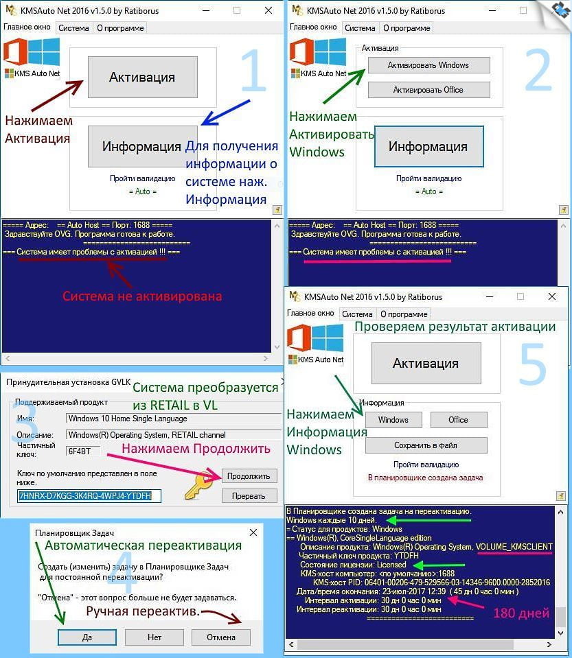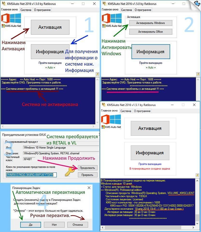 3 вариант. Если ничего не получается, то примените активатор. После установки системы на рабочем столе будет ярлык к папке с активаторами (На системном диске создастся папка 'Activators'). Советую KMSAuto Net. Активатор сначала преобразует систему из RET в VL и активирует. При таком способе активации необходимо каждые пол года (180 суток) производить переактивацию системы в ручном или автоматическом режиме для проф. и корпор. редакций или на 45 дней для домашней редакции. См. скриншот. Если активация не удалась с первого раза, повторите попытку после перезагрузки. Обязательно отключите антивирус или защитник Windows при активации и внесите активаторы в разряд доверенных.