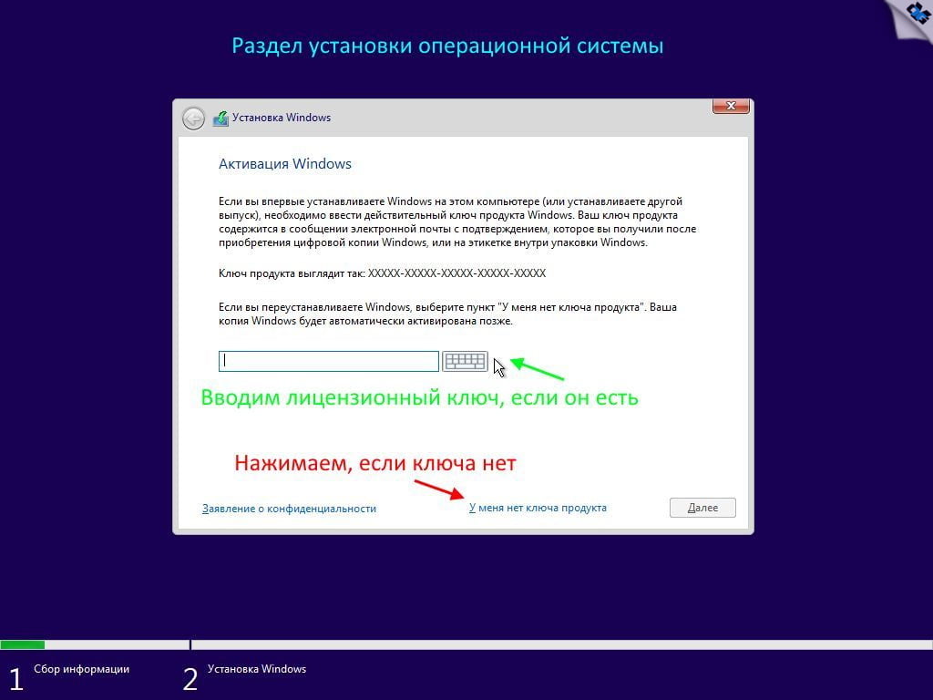 2 вариант. Если у вас есть лицензионный ключ от 10-ки, то его вы можете ввести как во время установки системы, так и после установки в соответствующих местах. Ключ должен соответствовать той системе, которую пытаетесь активировать.