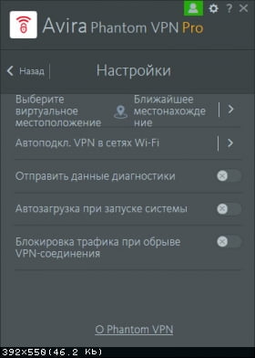 В меню настроек пользователь может беспроблемно изменить страну VPN сервера и настроить передачу диагностических данных в Avira. Кроме того, можно настроить автоматический запуск службы при старте системы.