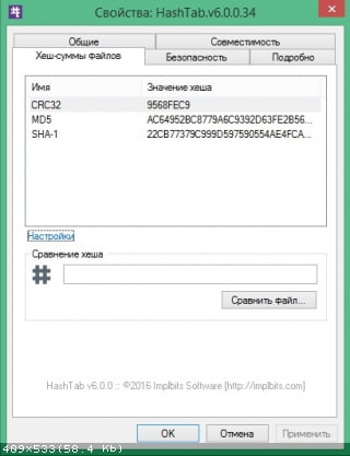 Описание:HashTab - программа для определения контрольных сумм загруженных файлов. Интегрируется во вкладку свойств Проводника. Позволяет определить путем сравнения контрольных сумм файлов, поврежден скачанный вами файл или нет. Если суммы не совпадают, необходимо загружать файл заново. Особенно актуально для больших архивов, образов дисков и т.п.