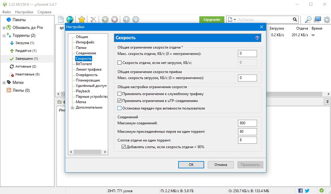- настройка для максимальной скорости загрузки и отдачи