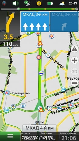 Навител Навигатор 9.8 прокладывает три альтернативных маршрута, отображая для каждого расстояние и время в пути. При соединении с Интернетом время рассчитывается с учетом текущей загруженности дорог. Переключаясь между предложенными программой вариантами, пользователь с легкостью выберет оптимальный маршрут.